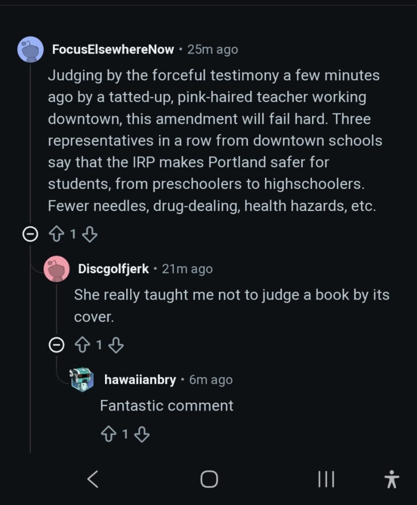 “Judging by the forceful testimony a few minutes ago by a tatted up, pink-haired teacher working downtown, this amendment will fail hard. Three representatives in a row from downtown schools say that the IRP makes Portland safer for students, from preschoolers to high schoolers. Fewer needles, drug dealing, health hazards, etc.
